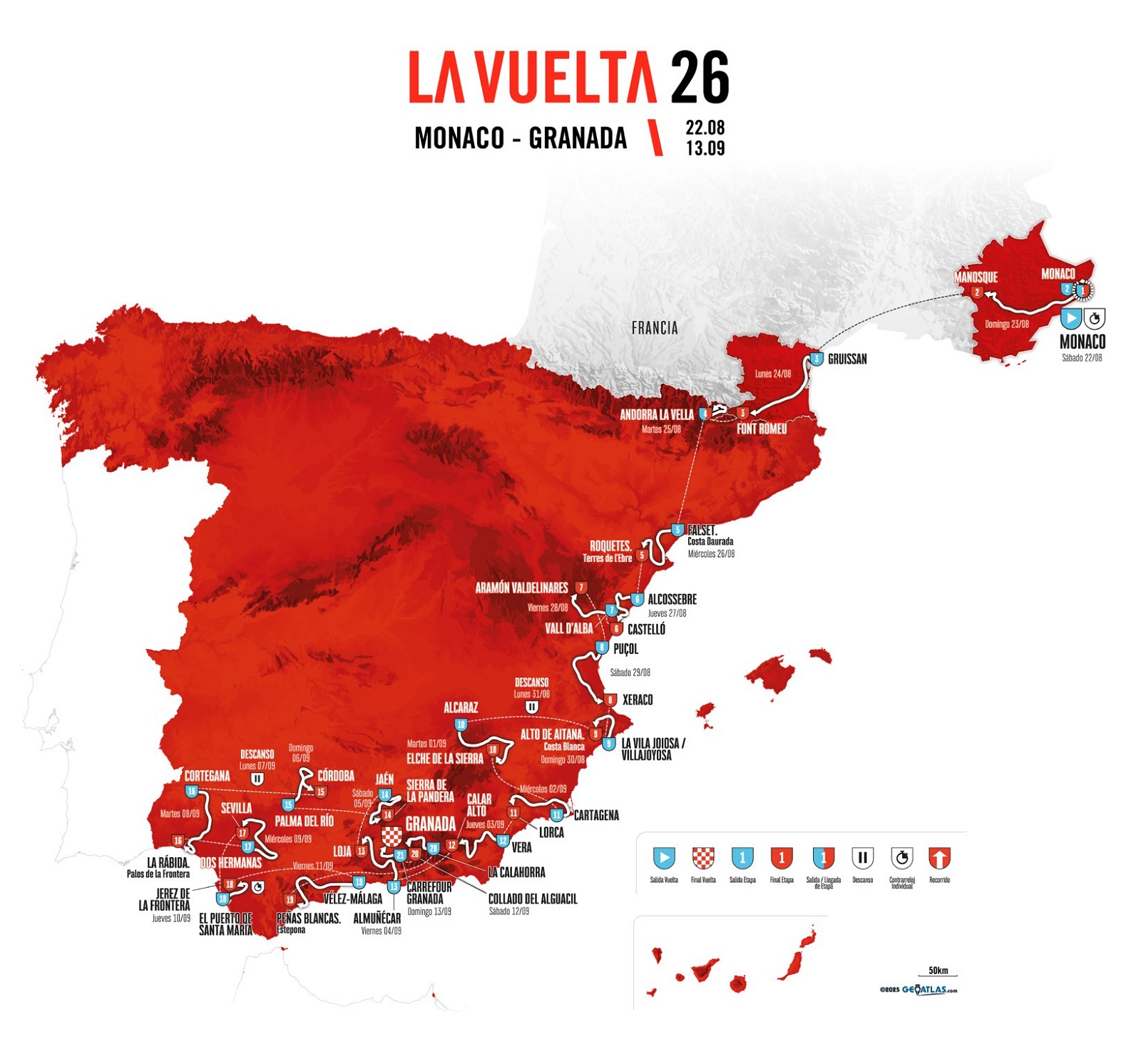 Está desvendado a Vuelta a Espanha 2026! A chegar ao final do mês de dezembro, ficava apenas faltar o percurso da última Grande Volta do ano e, finalmente, foi revelado em Madrid. Entre 22 de agosto e 13 de setembro, os ciclistas vão percorrer 3 276 kms, partindo do Mónaco e terminando em Granada. Madrid estará ausente do percurso devido à realização do GP de Fórmula 1. O tiro de partida será dado no principado do Mónaco com um curto contra-relógio de 9 kms que passará pelas rua do circuito citadino de automobilismo.
