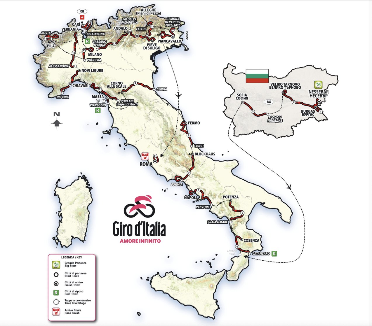 Está desvendado o Giro d’Itália 2026! O início do mês de dezembro foi palco de apresentação da Corsa Rosa e ficou-se a saber o percurso que os ciclistas terão pela frente entre 8 e 31 de maio do próximo ano. As notícias apontavam para uma Grande Partenza fora de Itália e confirmou-se com a Bulgária a acolher as primeiras 3 etapas da competição. O tiro de partida será dado em Nessebar e, em Burgas será uma surpresa se não for um sprinter a envergar a primeira camisola rosa da competição. A 2ª etapa, com final em Veliko Tarnovo, poderá ver as primeiras pequenas diferenças na geral, existe uma subida já nos derradeiros 10 kms e o último dia na Bulgária vai voltar a sorrir aos sprinters.