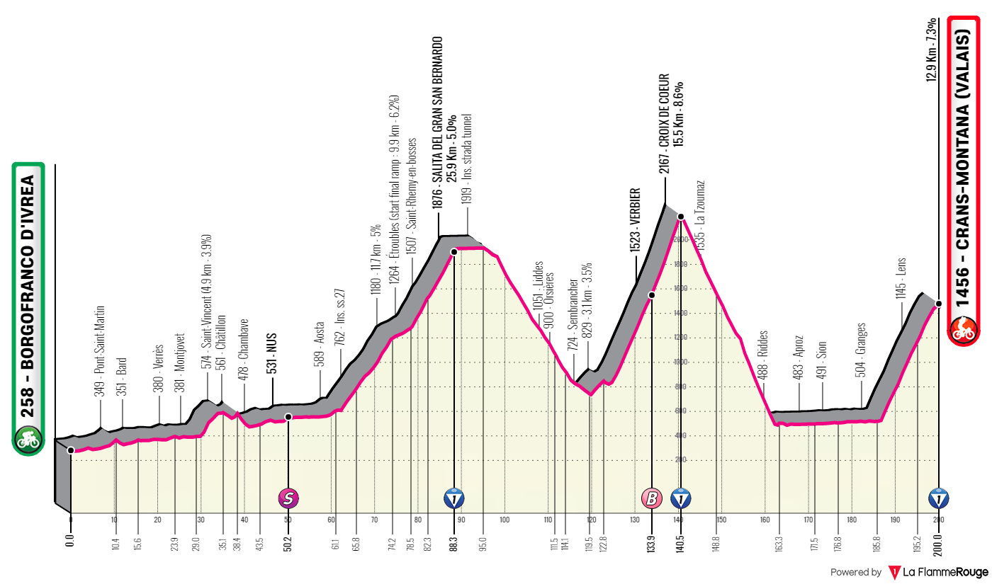 O Croix de Coeur é a montanha mais dura até agora, 15500 metros a 8,6% e com os 4 kms finais acima de 10% de média. São 15 kms de subida e 23 kms de descida bem acentuada e depois mais 23 kms de terreno completamente plano até à subida final que vai levar os ciclistas a Crans Montana, 12900 metros a 7,3% que prometem fazer imensas diferenças, é uma chegada relativamente constante, na média dos quilómetros nunca passa dos 9% e raramente desce dos 6%, sendo que os metros finais são mais acessíveis.