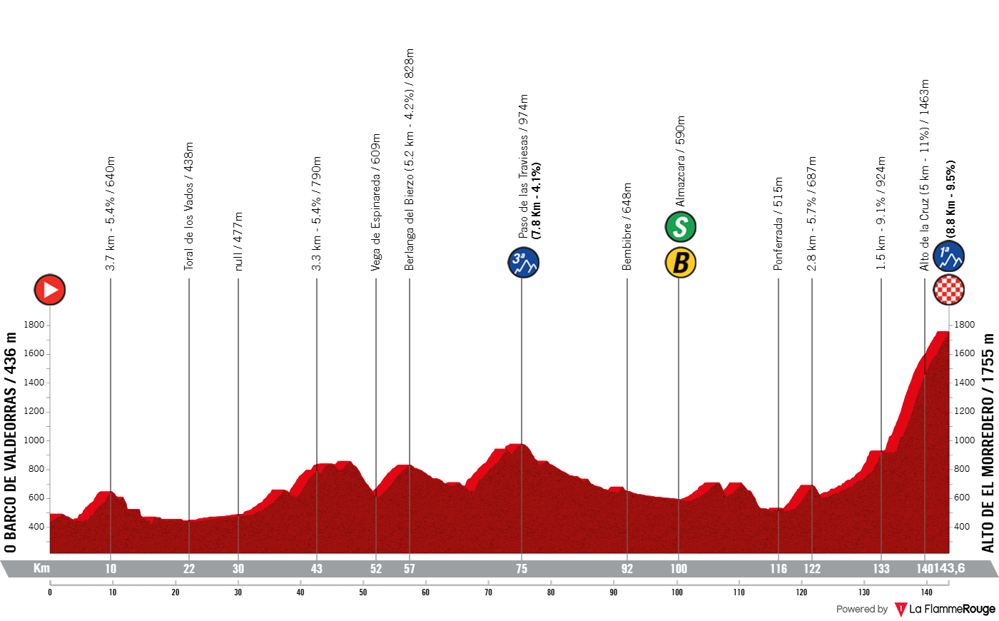 O Alto de El Morredero tem 8800 metros de extensão a uma inclinação média de 9,5%. Esta é uma ascensão bastante complicada, basta olhar para os números e se os ciclistas quiserem fazer diferenças terá de ser na primeira metade da subida uma vez que são os quilómetros mais duros, com 3 kms consecutivos a 11,7%, 13,5% e 11,9% de média! Ultrapassada esta fase ficam a restar 3,8 kms e as inclinações baixam para os 7-8%, o que continua a ser duro mas menos seletivo que o início.