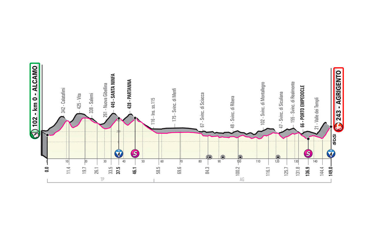 Apesar dos primeiros 50 quilómetros com algumas dificuldades, 4 subidas não muito longas (Entre 3-4 kms e a rondar os 4-5% de inclinação), a partir daí o terreno torna-se mais fácil e todos os olhos estarão na chegada a Agrigento (3.7 kms a 5,3%). Os quilómetros intermédios são os mais duros, com rampas a chegarem perto dos 7%, sendo os últimos 700 metros a 3,1%.