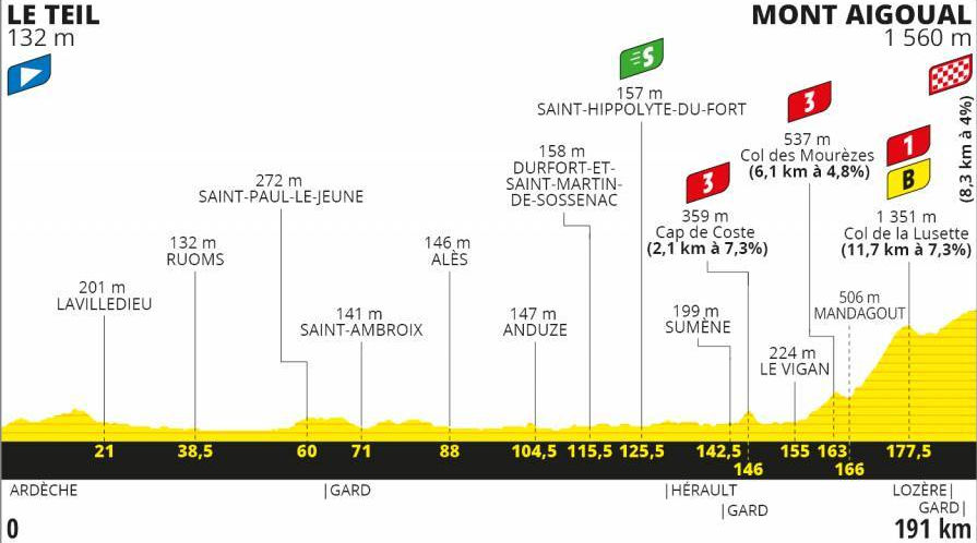 Depois de 155 kms relativamente planos começa uma nova fase da subida, apenas 2 subidas categorizadas, mas na verdade os últimos 35 kms são quase sempre em ascensão. Começa com 5800 metros a 5,1%, antes do Col de la Lusette, com 11,8 kms a 7,2%. Esta contagem de 1ª categoria é realmente bastante dura e no seu miolo tem 2 quilómetros a quase 11% de inclinação média. O seu final chega a 14 kms da meta e passado 6 kms começa o Mont Aigoual.