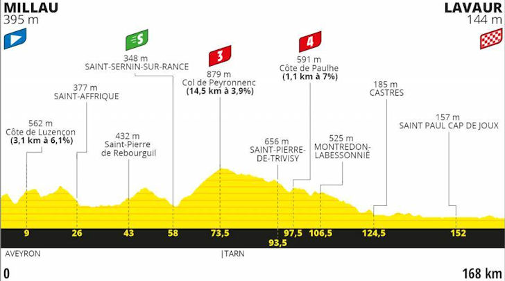 A primeira delas tem quase 5 quilómetros com o Col de Peyronnenc (14,9 kms a 3.8%) a marcar o final desta primeira fase da etapa. A partir daqui são quase 40 quilómetros em descida, intercetados por 3 pequenos topos. Os últimos 50 quilómetros são, finalmente, praticamente planos, ideais para a perseguição das equipas dos sprinters. O final é bastante simples, somente com uma rotunda a 1200 metros da chegada.