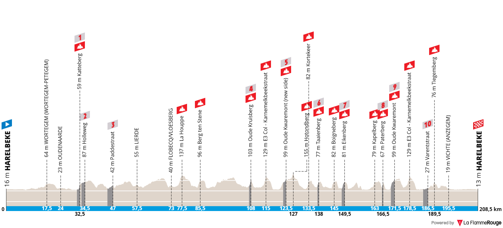 Seguem-se 15 kms de alguma acalmia, antes da entrada na fase decisiva da corrida, onde os ataques no pelotão vão começar a sério, vai começar a jogar-se tacticamente a corrida. O Kapelleberg (800 metros a 5%) será o aperitivo para o momento de todas as decisões numa combinação já conhecida por todos: Paterberg (400 metros a 9% em paralelo) e Oude Kwaremont (2,1 kms a 4,2%, subida em paralelo). Só por si, esta já é uma combinação dura, sendo que após ainda surge o Karnemelkbeekstraat (1500 metros a 5,2%). A 25 kms da meta ainda há o paralelo no Varenstraat, num total de 2000 metros e o Tiegemberg (800 metros a 4,8%). A partir daí não há mais dificuldades e só o jogo tático poderá decidir a corrida, se tal ainda não tiver acontecido.
