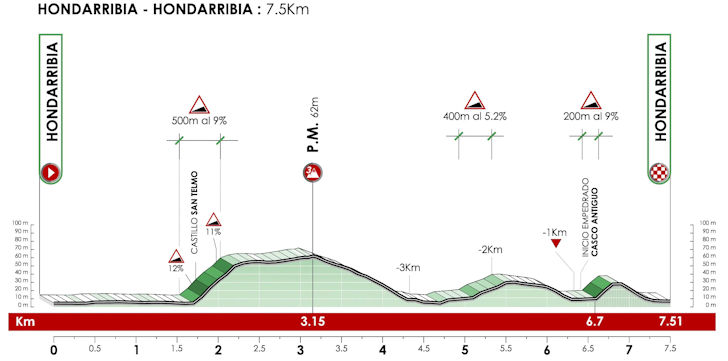 Não é propriamente o início de Volta ao País Basco a que estamos habituados, em Hondarribia haverá um contra-relógio individual de 7,5 kms bastante ondulado em que metade dele será a subir ou a descer, incluindo 2 rampas de 9% bem inclinadas, a primeira com 500 metros e a segunda com 200 metros, em empedrado.