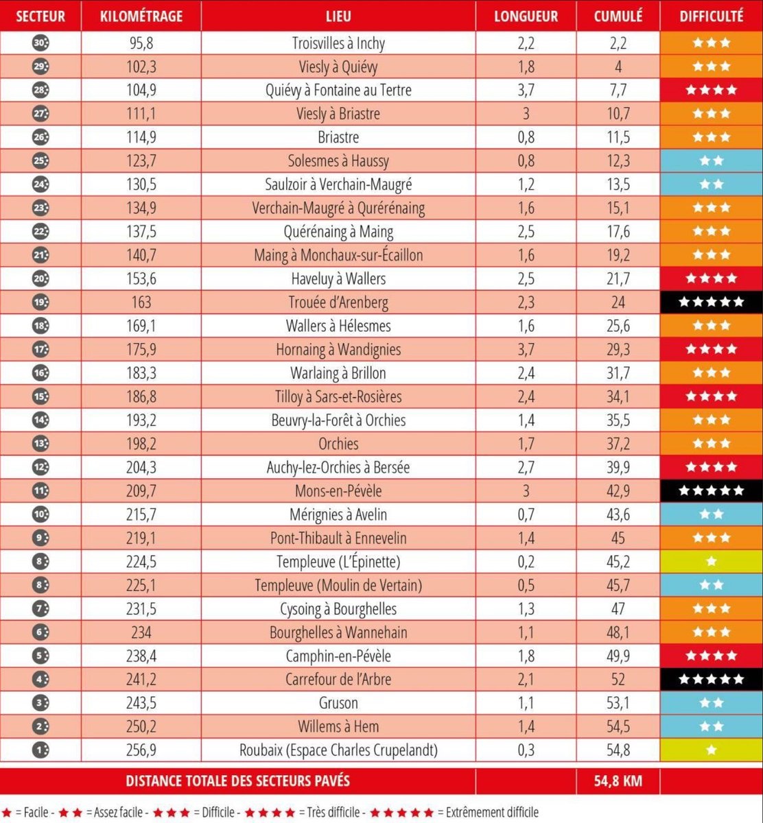Um verdadeiro mar de empedrado, que começa após quase 100 kms de asfalto plano, onde se vai definir a fuga do dia, um momento muitas vezes mais importante do que parece. Os primeiros sectores serão de muito nervosismo, uma batalha de posicionamento onde o importante é evitar problemas e a primeira grande selecção deverá fazer-se na Floresta de Arenberg, este ano antecedida de uma polémica chicane. Esse selecção tem mais 2 pontos fundamentais, Mons-en-Pevele e Carrefour de L’Arbre, pelo posicionamento no traçado e pelo grau de dificuldade dos mesmos. Aqui fica a lista dos 30 sectores de empedrado, os quilómetros e o grau de dificuldade correspondente, onde 1 estrela é o mais acessível e 5 estrelas o mais complicado.