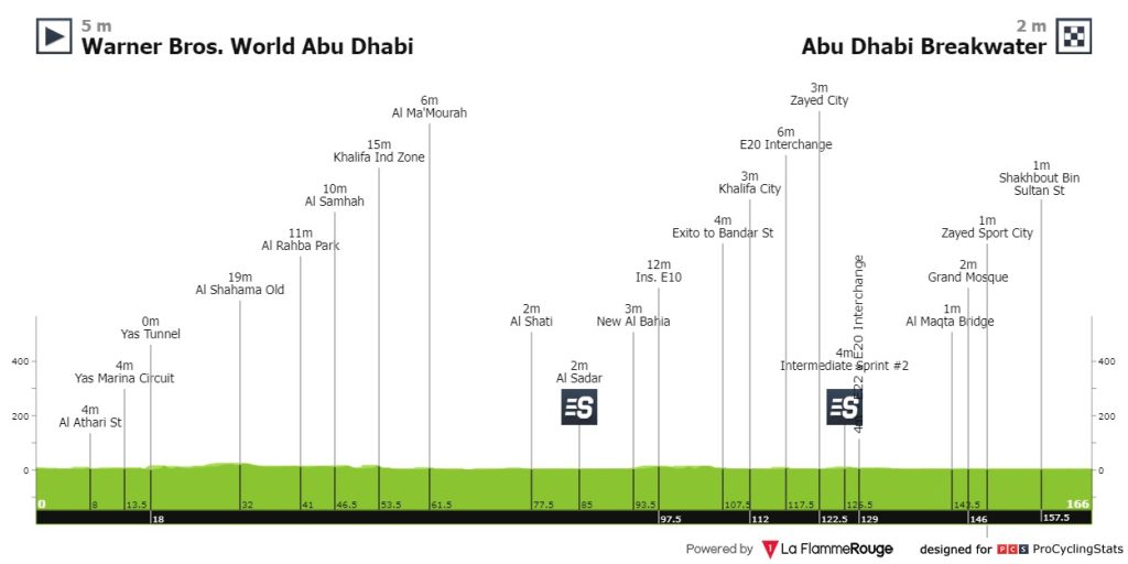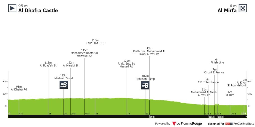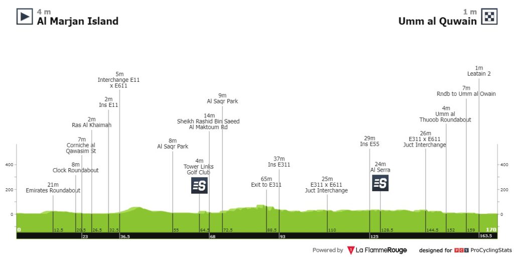 151 kms planos para abrir este UAE Tour, com final em circuito em Al Mirfa. A colocação nas últimas rotundas será muito importante.