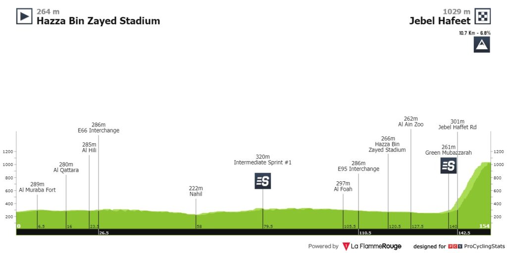 Primeira chegada em alto, final em Jebel Jais, uma subida com 19 kms a 5,6%. Será muito complicado uma equipa controlar e despedaçar o pelotão durante toda a contagem porque é muito raro a estrada empinar a mais de 7%. Geralmente mais de 20 ciclistas terminam nos mesmos 30 segundos e não é incomum vermos um sprint entre 1 dezena de corredores.