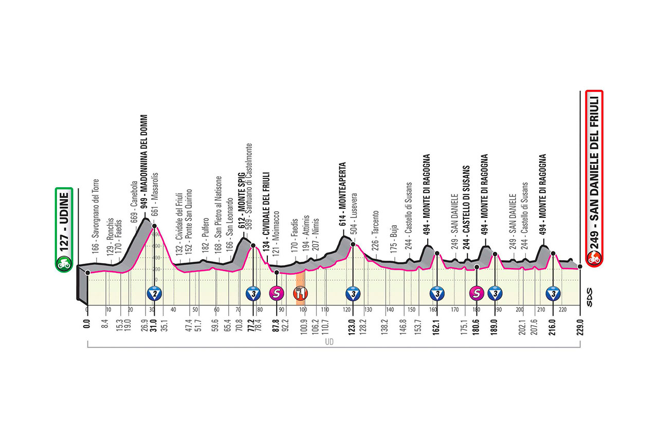 A semana final do Giro d’Itália começa com uma maratona de 229,5 quilómetros entre Udine e San Daniele del Friuli. Um dia com mais de 4000 metros de desnível acumulado positivo, e sem a verdadeira alta montanha!