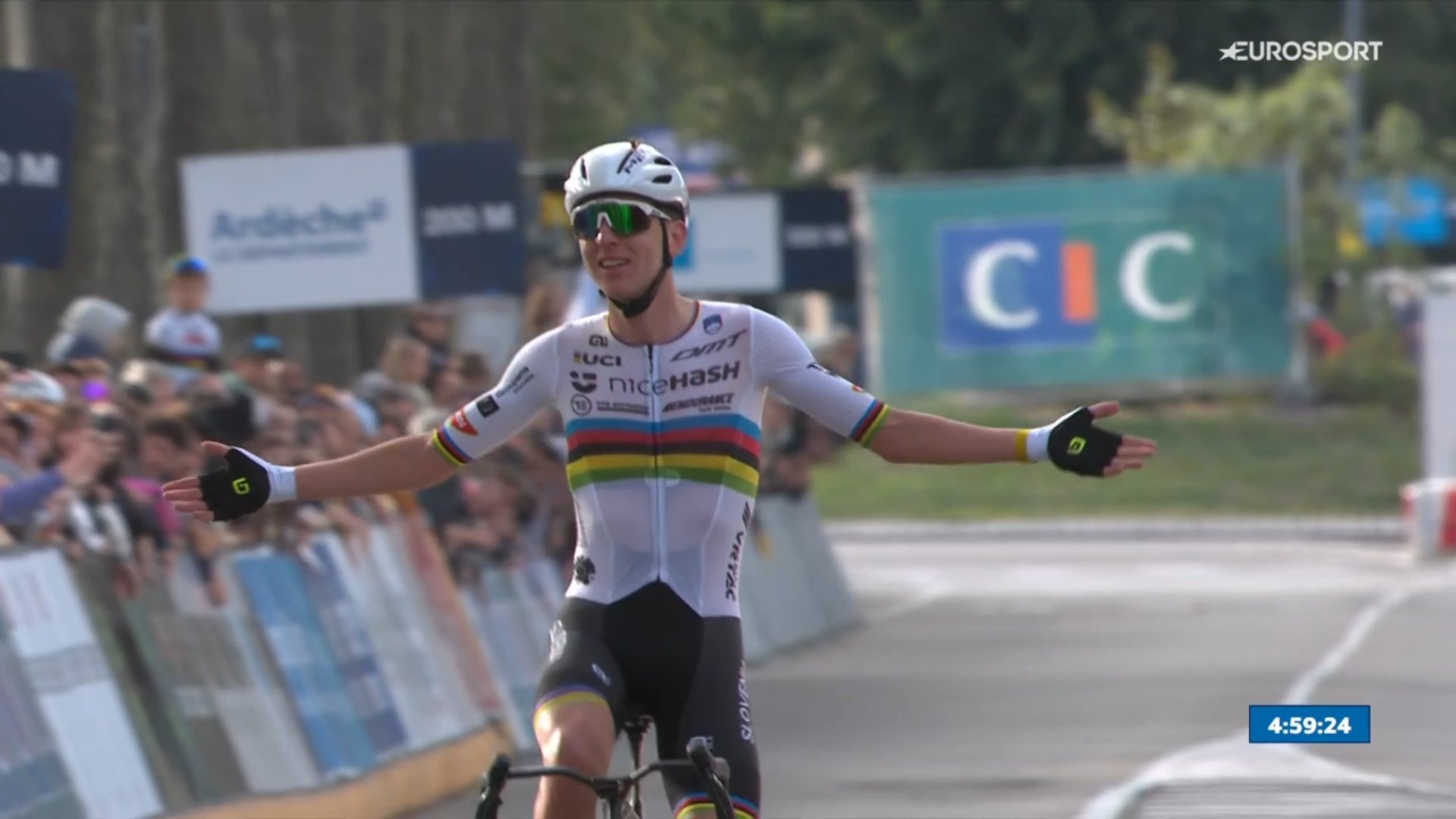 Pogacar ficava sozinho na frente, com Evenepoel a ficar num grupo com Ayuso, Seixas e Scaroni que durante alguns quilómetros manteve o esloveno por perto. A 50 kms do fim, a resistência quebrou, Pogacar começou a abrir espaço e, quando a diferença chegou a 1 minuto, Evenepoel isolou-se do grupo perseguidor. 38 kms para a chegada, duelo entre Pogacar e Evenepoel mas a diferença não baixou do minuto, mantendo-se assim nas voltas seguintes e até ao final.