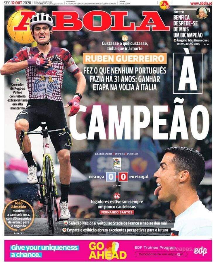 Por enquanto, para os fãs da modalidade é simplesmente apreciar, antes de sofrer por eles e com eles. Até porque João Almeida tem 2 camisola (rosa e branca) e Ruben Guerreiro 1 camisola (azul da montanha), ou seja, das 4 camisolas, os ciclistas portugueses têm 3. Temos 2 jovens, um de 22 anos e outro de 26 anos, a brilhar ao mais alto nível. Graças a eles e a mais alguns ciclistas de muita qualidade o futuro está garantido, nota-se perfeitamente o impacto que estas grandes exibições já estão a ter e uma prova disso a nível mediático é a excelente capa que o jornal “A Bola” tem hoje.