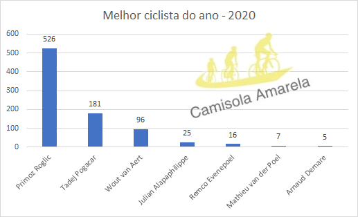 Os nossos leitores decidiram e elegeram Primoz Roglic como o melhor ciclista de 2020. Num total de xxx votos (obrigado pela participação), o esloveno recebeu 526 votos, o que equivaleu a 61% dos votos, esmagando a concorrência. A margem de vitória foi tão grande que Tadej Pogacar foi 2º com 181 votos e Wout van Aert 3º, com 96. Ainda hoje, sairá a 2ª sondagem, onde vamos eleger o sprinter do ano.